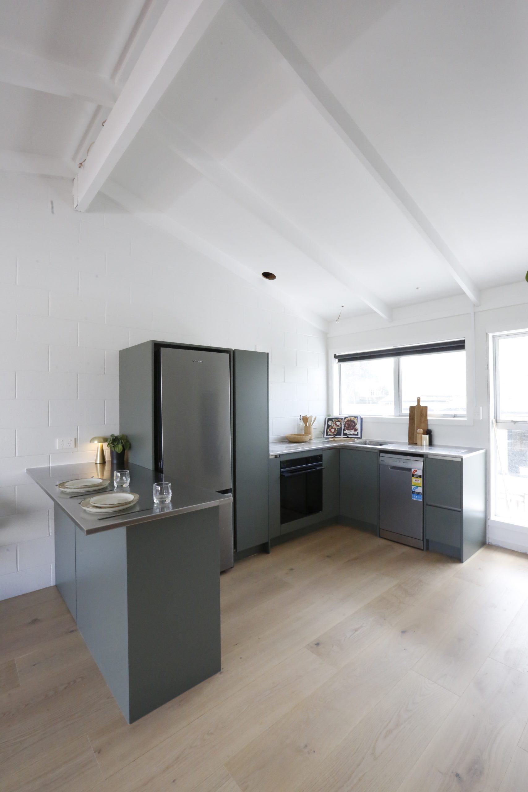 The highlight of this new kitchen is the colour scheme, with the cabinetry featuring Melteca’s Green Slate Pearl. It is an elegant hybrid of naturality and modernity – blending the best of both worlds in a revisionist-retro theme. This is exemplified by the plan for a stainless-steel benchtop – a staple of the late 20th century, now revived with modern features and design sensibilities. The stainless-steel theme extends to the Mercer Pressato sink and the Westinghouse fridge, the latter of which sits side by side a full-height pantry unit.