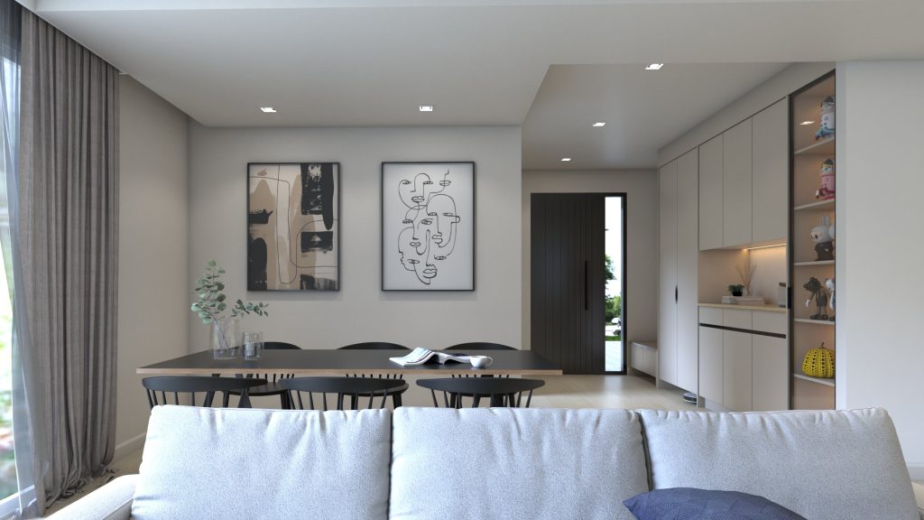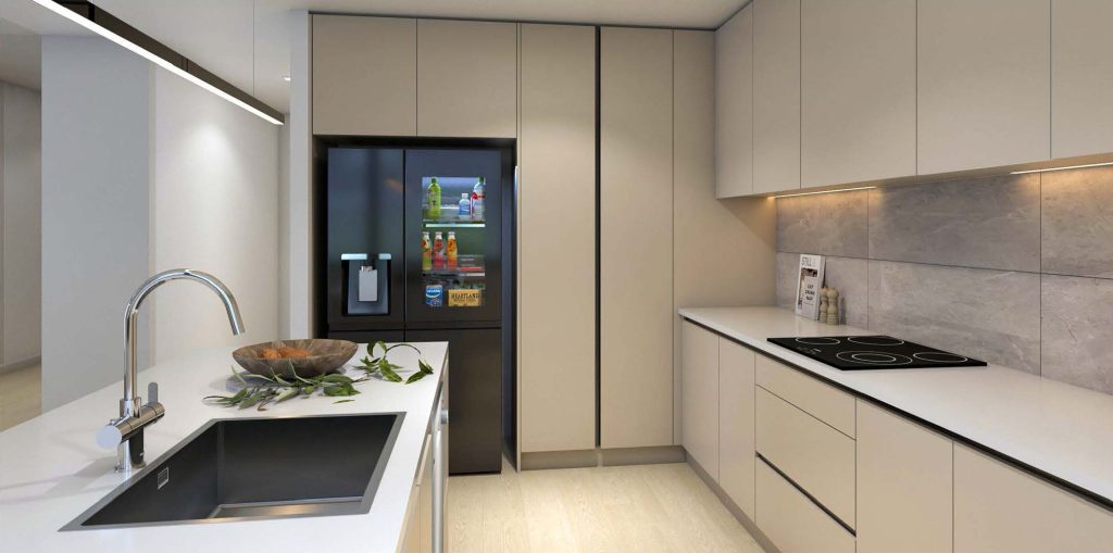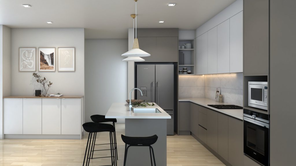 The core design philosophy behind this project is to create a minimalist, clean, and airy kitchen that feels simply freeing the moment you step in. A simple and light Scandinavian-style kitchen was the goal. The colours were selected to mirror this relieving nature, being a warm beige and gentle white. Melteca’s French Cream was chosen as the primary colour, a decadent tone evocative of elegantly-presented desserts.