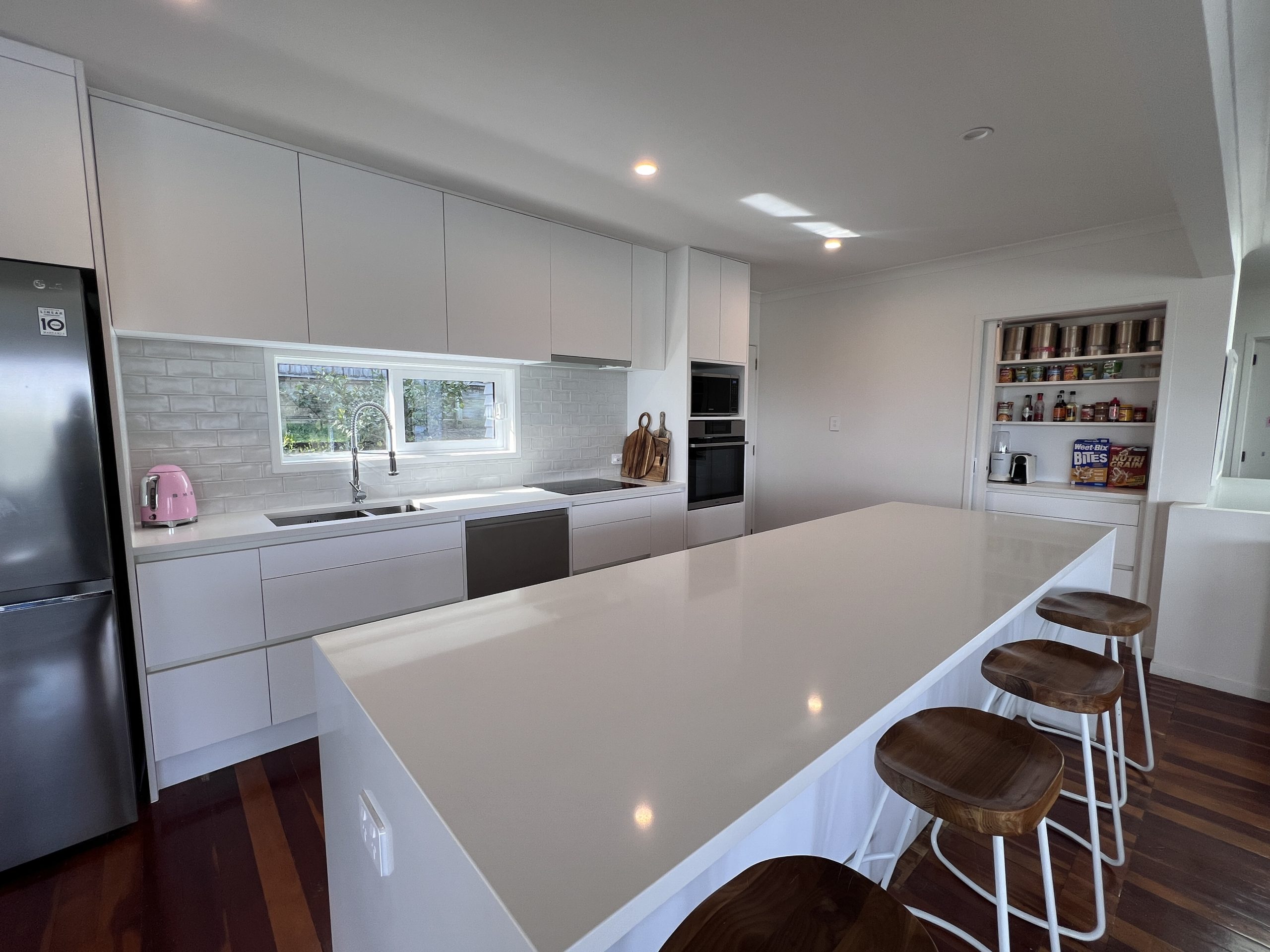 The cabinet doors are composed of a modern arrangement of vertical slats. Plytech supplied their Maestro Latt series, a premium panel which we selected in Pepper Oak on Black – an airy timber reprieve with a contrasting dark underlay for definition and effect. The two-tiered rail allows the entire until to be concealed, but the real mystery isn’t the panels themselves – it’s what behind them…