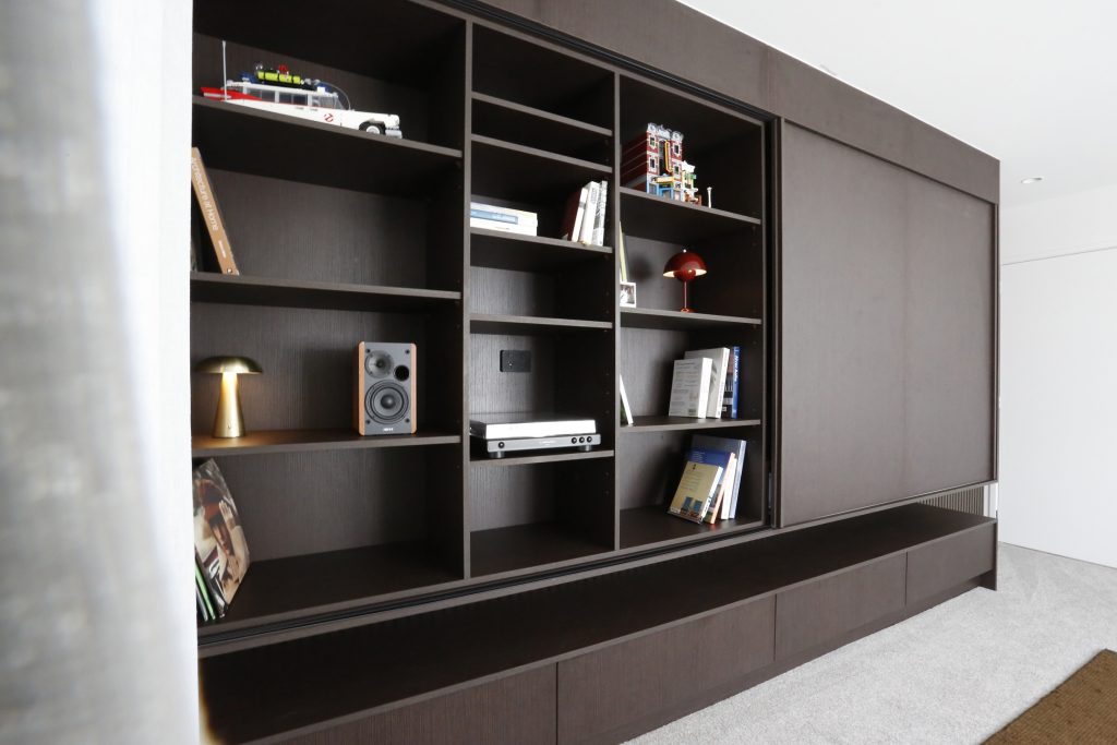 From the outset, we aimed to deliver the client’s goal of an atmospheric and immersive space. This involved a rich finish of Dark Oak Puregrain from Melteca. The melamine-on-MDF combo ensured high weight capacity while also facilitating our choice of finish.