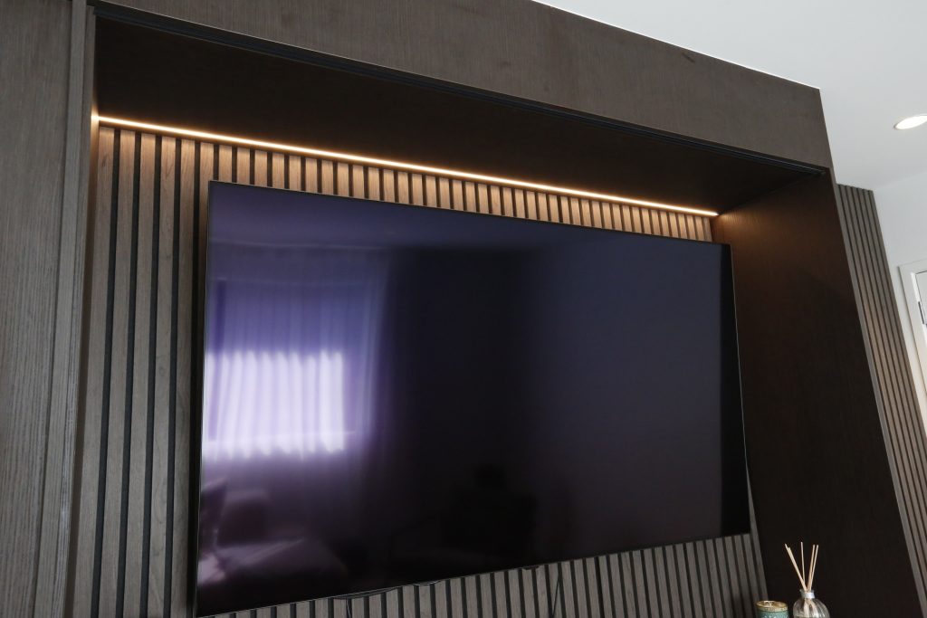 On the left, the unit sports an accommodating assortment of adjustable shelving, while the right half features a TV display with purpose-built shelves for consoles and accessories. This side is notable for having slatted acoustic panelling, shared with the backing pattern. We partnered with Profile Panels to deliver this sleek and performant solution. Its Natural Ebony colour is a perfect collaborator for the melamine panels, bringing modernity and dynamism to the aesthetic. Its soundproofing ability boosts the room’s aural performance while also dampening its disruption to other spaces.