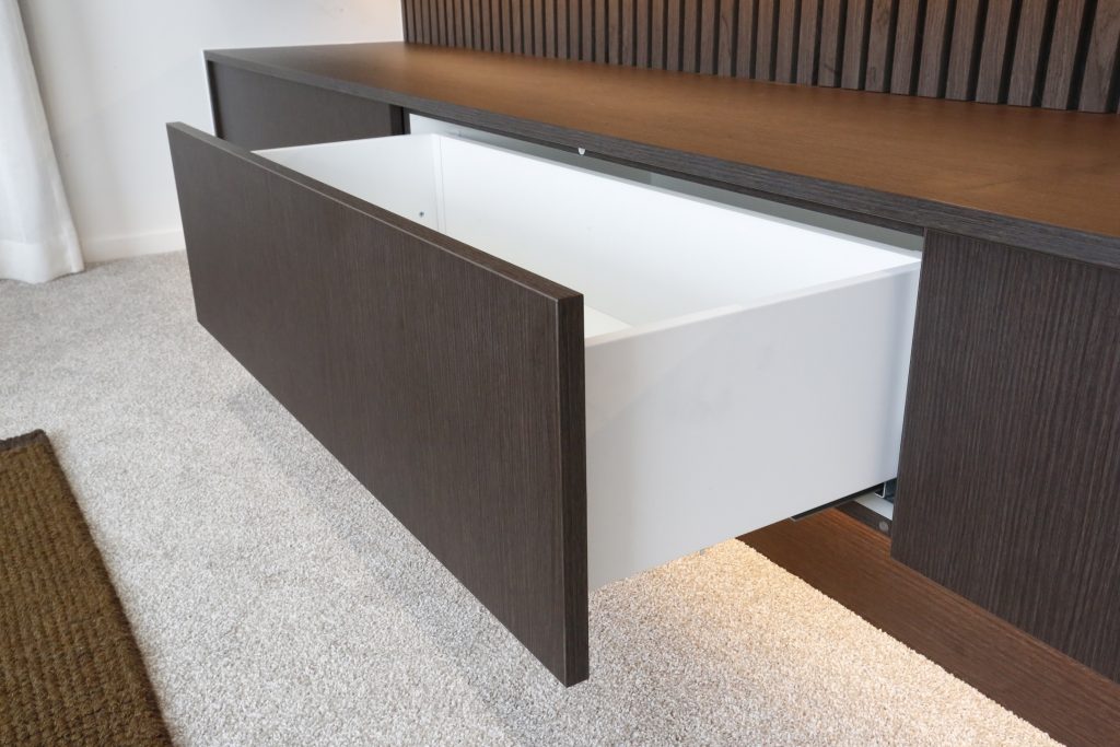 The bottom cabinets feature a symmetrical selection of four drawers. Featuring Häfele’s quality hardware, they are a breeze to open and close. Underneath, the toe kick features warm LED lighting from Domus Line, supplied by Fit NZ. It also appears in, and beneath the TV housing, matching ceiling light’s glow on the panel face. This gives a rich, theatrical atmosphere to the room. With room to accommodate even larger TVs, this entertainment unit allows for a veritable home theatre.