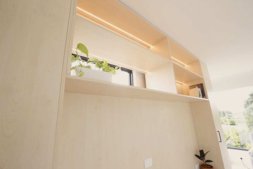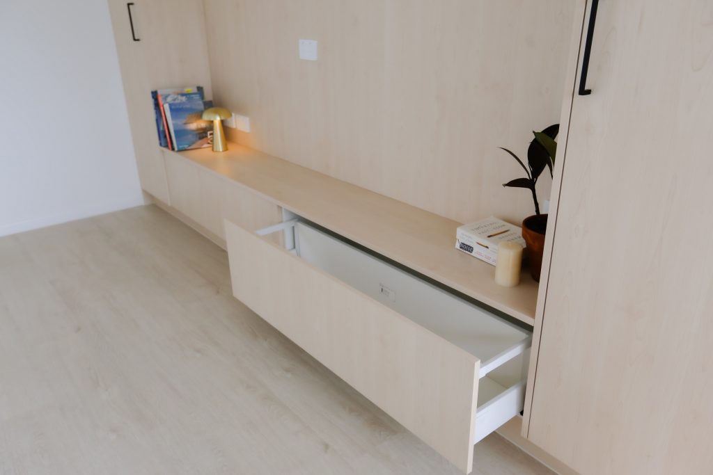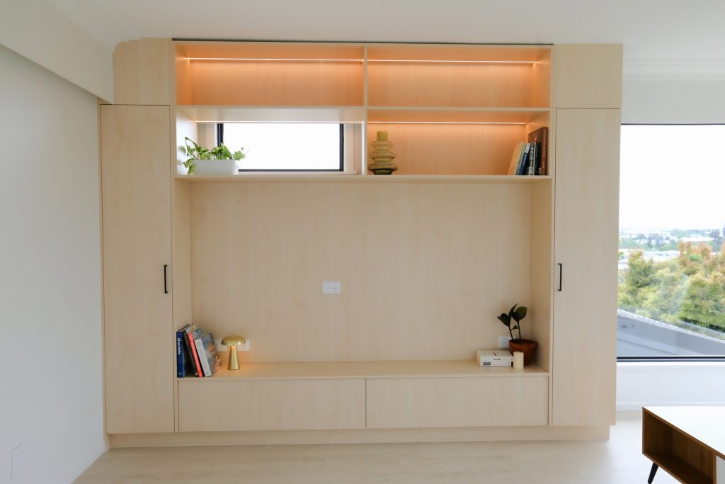 Our precision cut cabinetry used a 16mm MDF substrate with a finish that came in Bleached Maple Woodgrain by Prime Panels. This mirrored the look of the brand-new kitchen while also fitting perfectly with the hardwood floor. As far as storage is concerned, the cabinet offers four large shelves with backlit LEDs, dual vertical cabinets with ample shelving, and bottom drawers featuring Häfele’s runner systems.