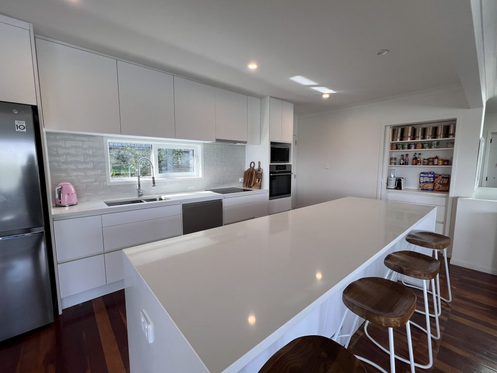 Aside from the colour uniformity, the Cockle Bay project also features a focus on clean lines and space-efficiency. The island runs parallel to the perfectly flush handleless designs of the main benchtop. This level design extends to the overhead cabinets, whose hidden handles and integrated rangehood provides a sleek, minimalist look. The cabinetry body is made from Prime Panels’ Melamine Embossed MDF range, while the face panels feature Decorpanel’s Matte Snow White.