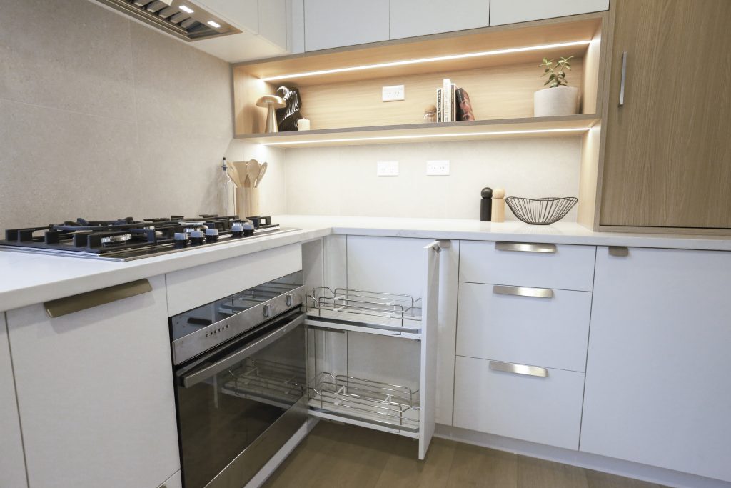 Make every inch count with an under-bench pantry unit. With different sizes to accommodate spices, bottles, and everyday groceries, these convenient units typically come in 1 or 2 tiers. Our Mount Roskill kitchen renovation featured a Sige Infinity Pullout Bottle Rack, supplied by Enko, which was perfect for complementing kitchen storage.