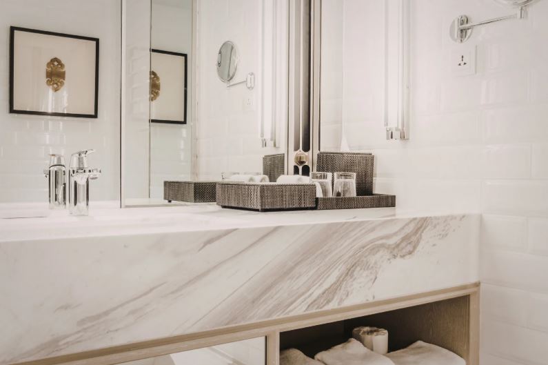 Natural Stone: Often serving as a high-end, all-in-one option that comprises both the base and the countertop, a solid piece of natural stone is the ultimate expression of bathroom luxury. Sometimes, even the basin is carved into the very surface. Commonly seen in premium hotels, malls, and resorts, these absolute units tout no equal when it comes to lavish presentation. Despite their looks, these stone vanities still come with some notable cons. Foremost is their gargantuan price tag, especially if you’ve suddenly developed a taste for Roman mountains. Second, natural stone’s porous nature means they need sealing just like any other moisture-vulnerable material. For stone, penetrating sealers work to fill the pours, while topical sealers form a protective surface film. Natural stone also offers few opportunities to incorporate cabinetry and storage.