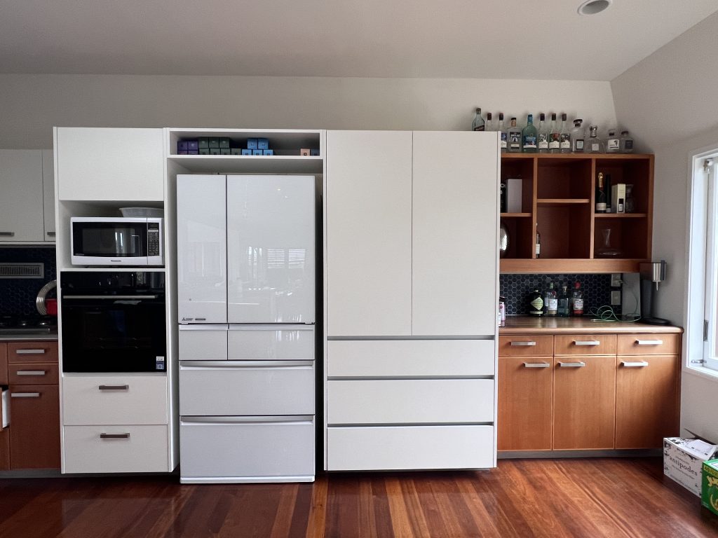 Our panel selection came in Quarter Thorndon Cream from Prime Panels: a slick melamine on MDF combination that serves as a fitting partner for the fridge’s glossy cool white. Starting from the left, the unit features a dual-drawer layout with an overhead cabinet. The oven was also replaced, which came in Bosch’s 8 Series.