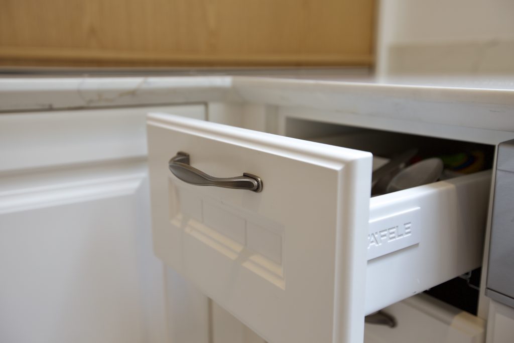 On the outside, it looks like a quaint transitional-style kitchen but inside, it has been rigorously fitted with the latest in cabinet solutions, soft-close drawers, runner sets, hinges, and LEDs. The cabinets feature Häfele’s drawer systems and Hideaway bins. Also supplied by Häfele are Kesseböhmer’s Dispensa Pantry, LeMans II corner unit, and 2x Base Cabinet Pull Out sets.