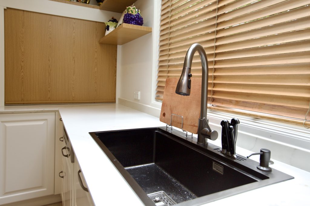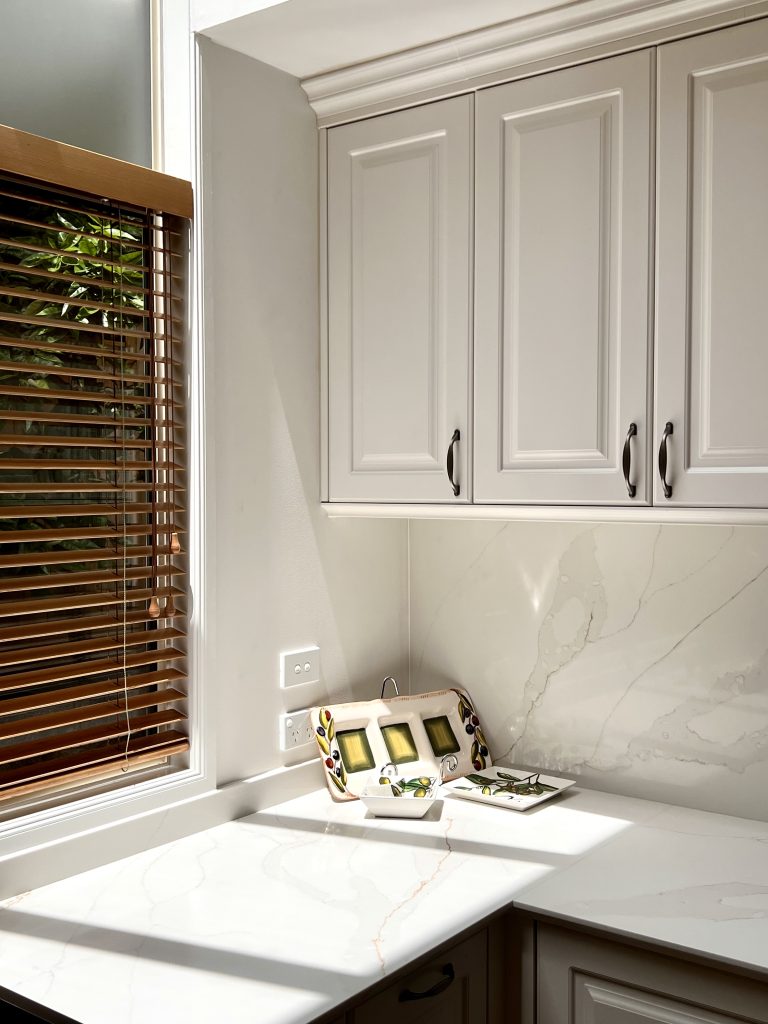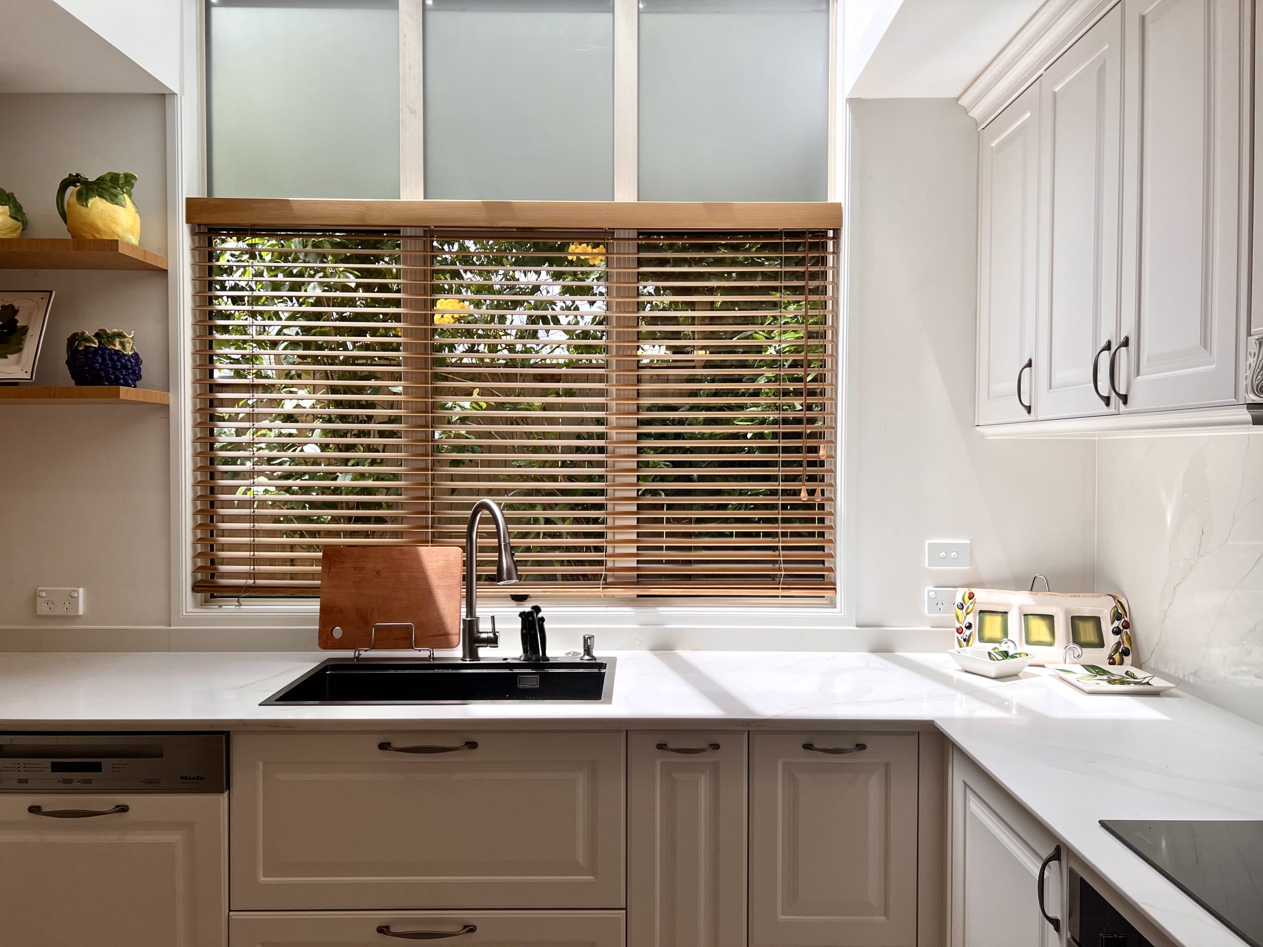 The benchtop is engineered stone – Uniquartz’s Light Vein, a pale 30mm cut featuring delicate brown lines. This design extends to the splashback for a cohesive and finely detailed kitchen. Both the cooktop and sink feature minimalist, low-profile designs. Behind, the wooden blinds give the room an organic touch as it combines seamlessly with the greenery outside – a detail that was replicated from the previous kitchen.